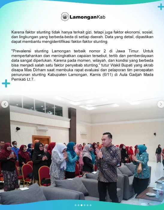 "Prevalensi stunting Lamongan terbaik nomor 2 di Jawa Timur. Untuk mempertahankan dan meningkatkan capaian tersebut, tertib dan pemberdayaan data sangat diperlukan. Karena pada momen, wilayah, dan kondisi yang berbeda bisa menjadi salah satu faktor penyebab stunting," tutur Wakil Bupati yang akrab disapa Mas Dirham saat membuka rapat evaluasi dan pelaporan tim percepatan penurunan stunting Kabupaten Lamongan, Kamis (6/11) di Aula Gadjah Mada Pemkab Lt.7.