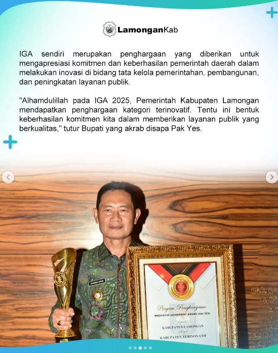 "Alhamdulillah pada IGA 2025, Pemerintah Kabupaten Lamongan mendapatkan penghargaan kategori terinovatif. Tentu ini bentuk keberhasilan komitmen kita dalam memberikan layanan publik yang berkualitas," tutur Bupati yang akrab disapa Pak Yes.